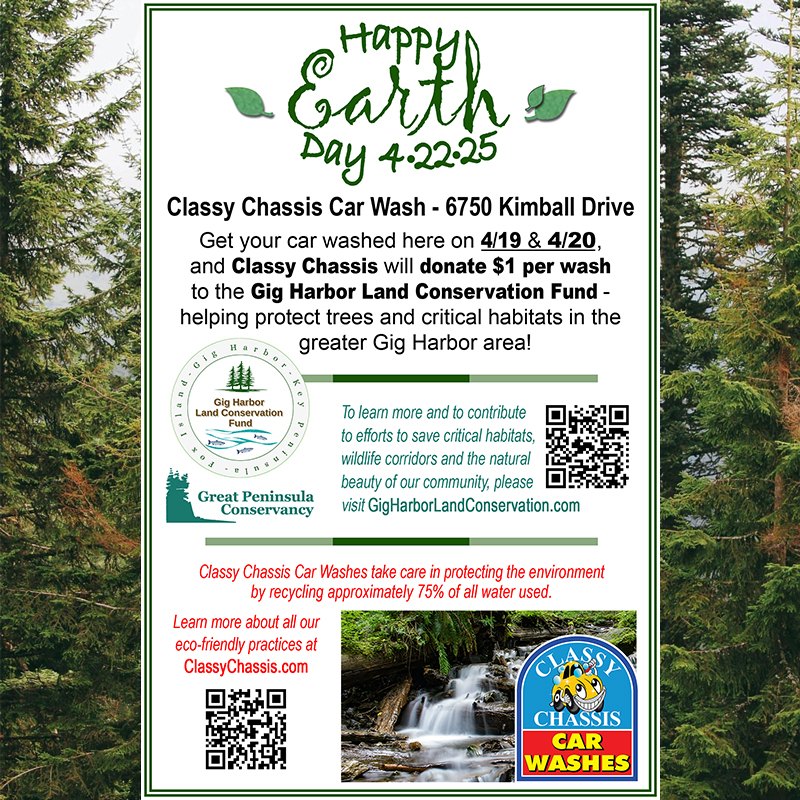 | Fundraiser Car Wash at Classy Chassis Car Wash in Gig Harbor Get your car washed Saturday or Sunday (April 19/20) at Classy Chassis Car Wash in Gig Harbor! They'll donate $1 per car to the Gig Harbor & Key Peninsula Land Fund, a volunteer committee of GPC. Our friends at Classy Chassis have been awesome partners for years and we are so grateful for their commitment to conservation (and clean cars)! Mark your calendars and share with your friends! When: Saturday and Sunday, April 19th and 20th Where: Classy Chassis Car Wash, Gig Harbor |