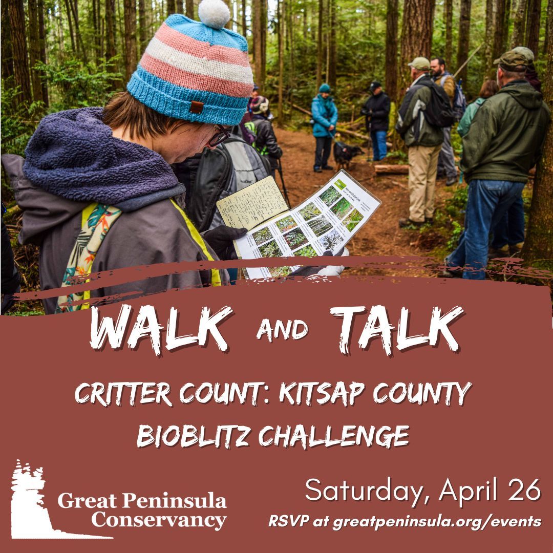 | Critter Count: Kitsap County Bioblitz Challenge Join GPC for a bioblitz of the Carpenter Creek Watershed! Be a part of a coalition of Kitsap-based organizations documenting local plants, animals, and fungi to better understand the area’s ecological health. We’re participating in the City Nature Challenge, it’s a bioblitz-style competition where cities are in a friendly contest with each other to see who can make the most observations of nature and who can find the most species! When: Saturday, April 26th, 10:00am – 12:00pm Where: Kingston |