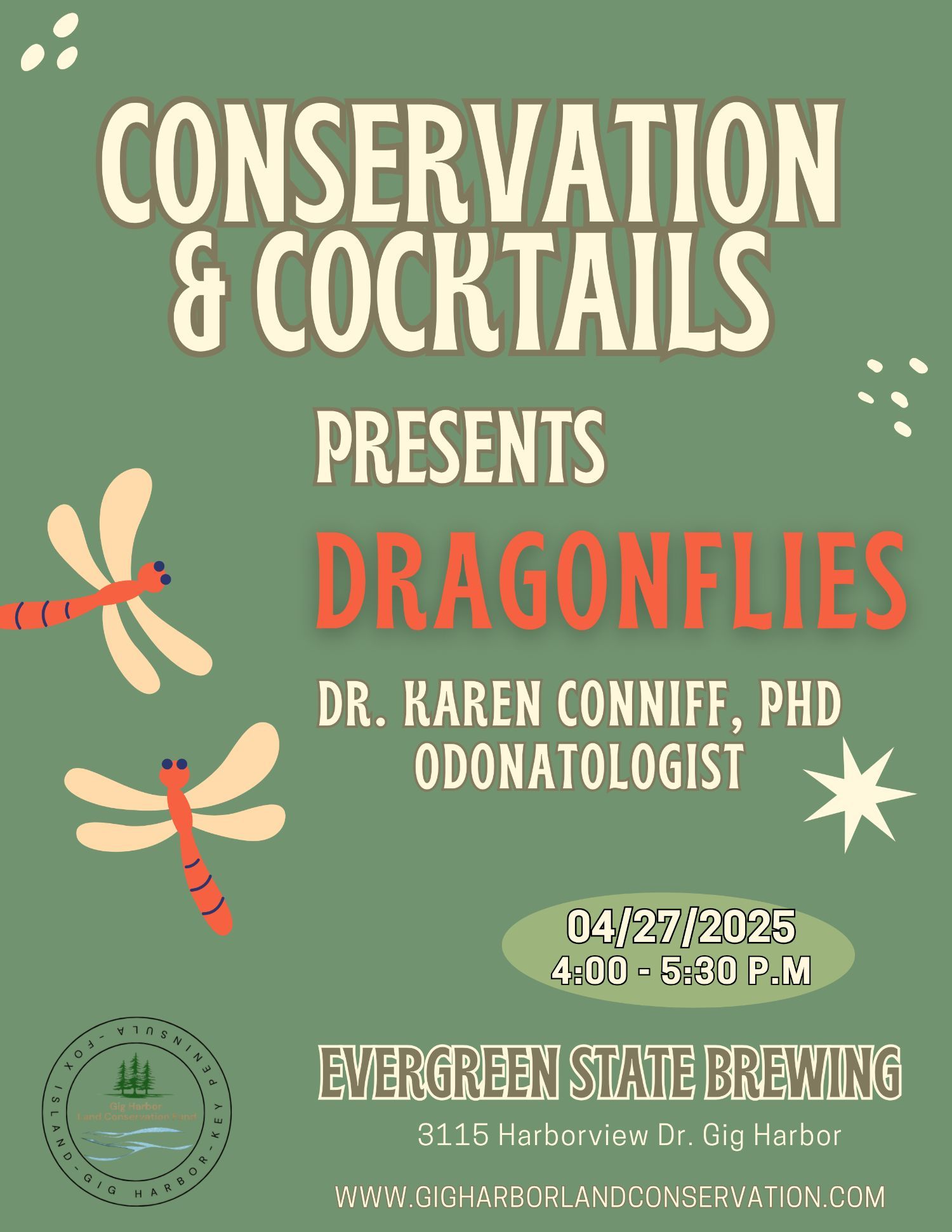 | Conservation & Cocktails Presents: Dragonflies Fascinated by dragonflies? Join GPC staff and members of the Gig Harbor & Key Peninsula Land Fund, a volunteer committee of GPC, for our next Conservation and Cocktails event! Odonatologist Karen Conniff, PhD, will reveal the secrets of these incredible flying creatures. Dr. Conniff has conducted research and fieldwork in Botswana, Egypt, Nepal, Sri Lanka, the Himalayas and collaborated on a study tour of the Nile Basin. She's even described four new species. Come learn more! When: Sunday, April 27th, 4:00pm – 5:30pm Where: Evergreen State Brewing, Gig Harbor |
