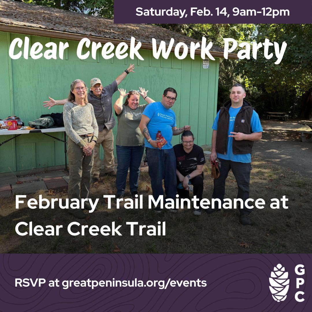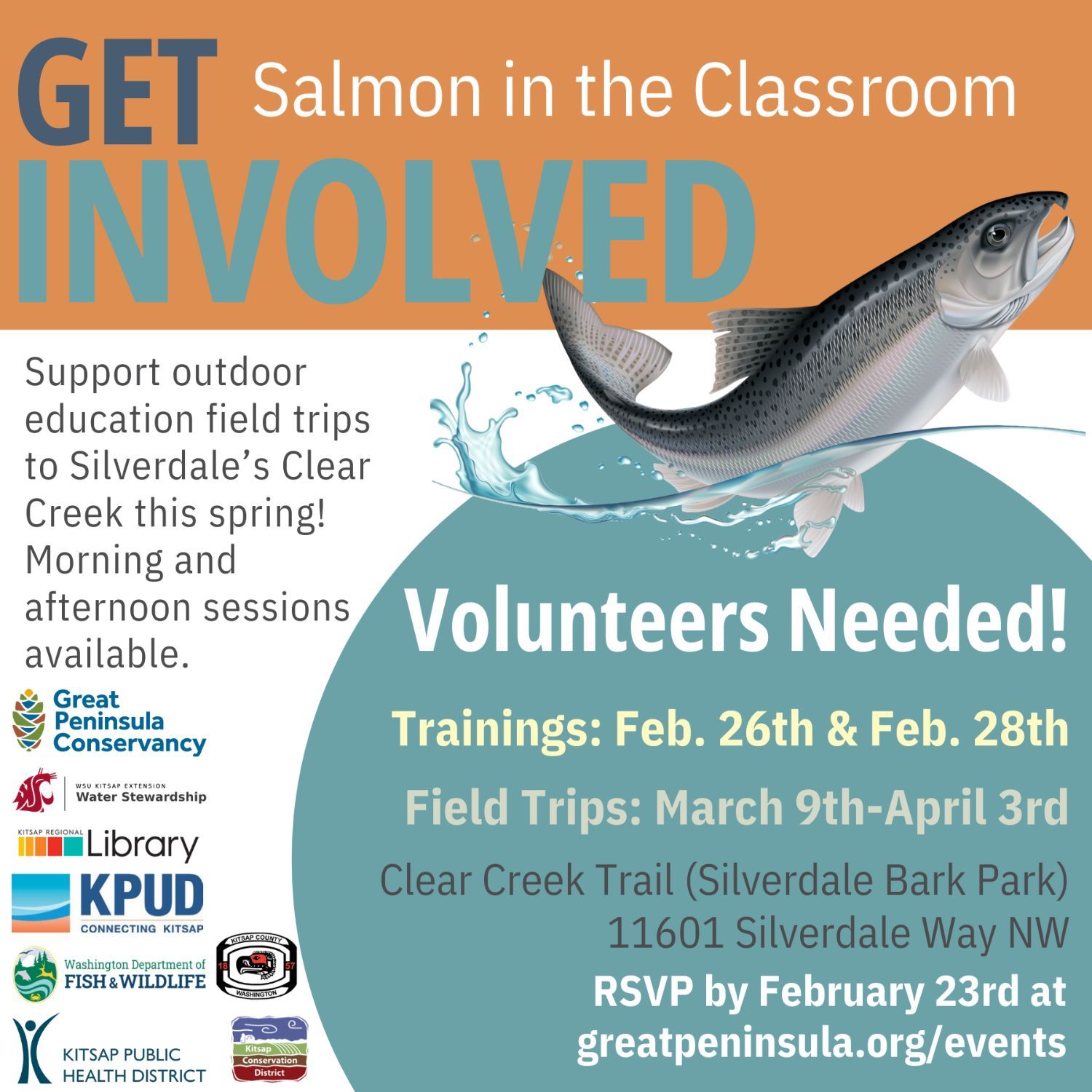 Click the Sign Up button to see all Salmon in the Classroom training dates. | | | | | | | | Stillwaters Online Book Sales | | Want to expand your library in an environmentally friendly way? Shop Stillwaters’ online used book sale at AbeBooks. Stillwaters Environmental Center's long-running online book sale has continued, thanks to dedicated volunteers, through the transition to GPC. You can shop for our books online, all year round at AbeBooks! Click HERE to browse our online books for sale. If you are interested in donating books, we accept them all year long. Contact us at info@greatpeninsula.org for more information. | | | | | | | | | | Winter Land Labs Volunteer Training Want to get outside and share your love of nature with local youth? GPC’s Land Labs program is calling all volunteers interested in helping with our winter field trip series. No experience needed! We’ll teach you everything you need to know at our next Land Labs Volunteer Training. The training will focus on how to best support local students as they engage in real-world science questions out on GPC preserves. In our winter module, students will explore how land has been protected and managed over time, learn about present-day conservation efforts, and discover ways in which land trusts are restoring ecologically valuable places, such as forests and urban trails. Get outside and help lead lessons, run activities, and foster our next generation of conservationists! If you love talking about trees and getting your boots a little muddy… then volunteering to help kids with this lesson is for you. When: February 5th, 1:00pm – 4:00pm Where: Silverdale, WA | | | | | | | | February Clear Creek Trail Work Party Bring a loved one or be our Valentine at this February’s Clear Creek Trail work party! We’ll be showing the trail some extra love by removing invasive plants, picking up litter, repairing boardwalks, and more. Come out on the holiday to help out, and we’ll have sweet treats waiting for you! When: February 14th, 9:00am – 12:00pm Where: Silverdale, WA | | | | | | | | Birding with the Listen Up Collaborative at Grovers Creek Preserve Birds are talking—we just need to listen! Join us at Grovers Creek Preserve to learn about GPC’s ecological forest restoration efforts and how we’re using birds to measure success. We’ll walk the preserve with GPC’s Stewardship Director Adrian Wolf and discover how the Listen Up Collaborative, a local coalition of land trusts, tribes, and forest groups, uses avian indicators to rate stewardship work. This is a great opportunity to sharpen your birding skills while learning about habitat restoration. When: February 21st, 10:00am – 12:00pm Where: Poulsbo, WA | | | | | | | | Salmon in the Classroom Volunteer Training Take part in this year's Salmon in the Classroom field trip series as a volunteer! Salmon in the Classroom volunteers are trained on each of the four stations that students rotate through, and will assist in leading the educational program. This is an opportunity to help students build a lifelong relationship with nature. Volunteers will be trained in outdoor education techniques that meet BEETLES and Next Generation Science Standards. No experience necessary! When: February 26th & February 28th Where: Silverdale, WA | | | | | | | | Bandit Theater Presents Mad Science: A Night of Improv and Laughter with GPC’s Adrian Wolf Science, Technology, Engineering, Math, and improv comedy unite for Bandit Theater’s Mad Science. Every show, special guests are invited to share their real cutting-edge research and stories from the academic front line for the Mad Science team of improv comedians to warp, twist, and turn on its head. February’s special guests are Adrian Wolf, Stewardship Director of Great Peninsula Conservancy, and Irene Weber, Natural Resources Program Supervisor at Kitsap County Parks. Join the fun and learn how $80 recorders and bird songs are revolutionizing conservation—then watch our comedians turn science into laughter. When: February 27th, 7:00pm Where: Seattle, WA | | | | | | | | Tree Planting and Habitat Restoration at Gass Preserve Join Great Peninsula Conservancy for an exciting planting project at Gass Preserve in Seabeck, one of our newest protected sites! This site has been cleared of old buildings and is ready for ecological restoration. Volunteers will help plant a wide variety of native trees and shrubs to bring new life to this special place. The work party will include two shifts on the same day: a morning shift from 9:30–11:30 AM and an afternoon shift from 12:00–2:00 PM. Volunteers are welcome to sign up for one shift or stay for both. This project permanently protects a 13-acre property, including seven acres of tidelands, along the eastern shore of Hood Canal in Kitsap County. The preserve includes 530 feet of shoreline and 400 feet of Johnson Creek as it flows into the nearshore environment. Though modest in size, Gass Preserve plays an outsized role in supporting Hood Canal summer chum and Puget Sound Chinook salmon recovery, making this restoration effort especially meaningful. When: February 28th, 9:30am – 2:00pm Where: Seabeck, WA | | | | | | | | Friends of Miller Bay Winter Work Parties | | The Friends of Miller Bay (FOMB) work party schedule is live! FOMB regularly holds work parties at GPC preserves within Miller Bay. Come out, and meet neighbors and members who care about our environment! Be sure to sign the waiver on the FOMB Volunteer Page and sign up so they know you're coming. Upcoming Events: -